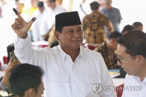Indonesian presidential candidate Prabowo Subianto displays his finger marked with ink to his supporters at a polling center at Bojong Koneng Village in Bogor, Indonesia, 17 April 2019. More than 192 million Indonesians cast their votes to elect the president, vice president and members of the House of Representatives as well as Regional Representative Council. EPA/ADI WEDA