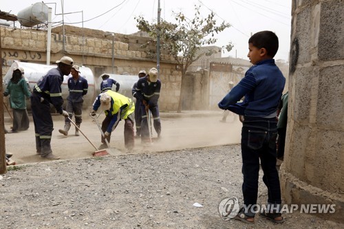 A child looks on as sanitation workers clean up a street in a residential area as part of an anti-cholera campaign, amid a cholera outbreak in Sana?a, Yemen, 24 April 2019. According to reports, an acute cholera outbreak has spread widely in Yemen with more than 1.2 million cholera cases and about 3,000 cholera deaths since the epidemic began 2016, including more than 460 deaths of cholera have been registered in the war-torn Arab country since the beginning of 2019. EPA/YAHYA ARHAB