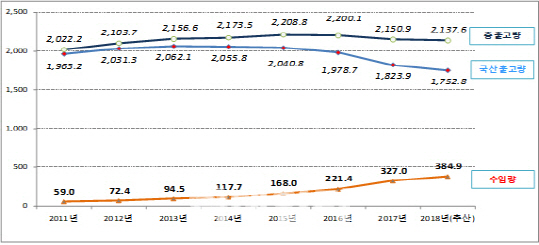 ±¹³» ¸ÆÁÖ ½ÃÀå¿¡¼­ÀÇ ÃÖ±Ù 5³â°£ ¿¬Æò±Õ Ãâ°í·®À» »ìÆìº¸¸é ±¹»ê ¸ÆÁÖÀÇ °æ¿ì ¿¬Æò±Õ(5³â Æò±Õ) 2.1% °¨¼ÒÇÑ ¹Ý¸é ¼öÀÔ ¸ÆÁÖ´Â 35.5% Áõ°¡Çß´Ù. ¼öÀÔ ¸ÆÁÖ´Â ¡®4ĵ¿¡ ¸¸¿ø¡¯ Çà»ç µîÀ» ÅëÇØ ÆÇ¸Å·®ÀÌ ´Ã¾î³µ´Ù. ÀÌÈÄ ±¹³» ¾÷°è¿¡¼­ ±¹³»¿Ü ¸ÆÁÖ °ú¼¼ ü°èÀÇ ÇüÆò¼º ¹®Á¦¸¦ Á¦±âÇß°í ±âÀçºÎ°¡ ÁÖ¼¼ ü°è °³Æí¿¡ ³ª¼­°Ô µÆ´Ù. ´ÜÀ§=1000§¥.[ÀÚ·á ±¹¼¼Ã», ±¹¼¼Åë°è¿¬º¸, Çѱ¹ÁÖ·ù»ê¾÷Çùȸ]