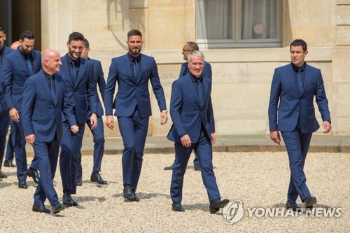 France's national soccer team head coach Didier Deschamps (2-R) and players arrive for a reception at the Elysee Palace, Paris, France, 04 June 2019. French national soccer team players will be presented with the 'Chevalier de la Legion d'Honneur' medal, (National Order of the Legion of Honour) after winning their second World Cup on July 15 2018 in Russia. EPA/CHRISTOPHE PETIT TESSON