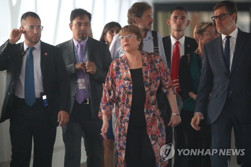 United Nations High Commissioner for Human Rights Michelle Bachelet (C) arrives at the Maiquetia International Airport in Caracas, Venezuela, 19 June 2019. Bachelet arrived in Venezuela for a three-day working visit to meet with officials and alleged victims of violations of fundamental rights. EPA/Miguel Gutierrez