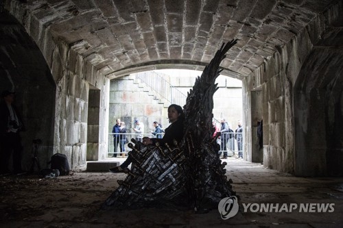 A 'Game of Thrones' fan poses for a photo next to the Iron Throne, which has been set up in Fort Totten Park in Queens, New York, USA, 29 March 2019. The promoting campaign consists on 6 thrones hidden around the world, before the launch of the final season of 'Game of Thrones'. EPA/ALBA VIGARAY