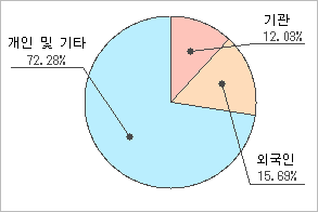 ÃÖ±Ù ÇÑ´Þ°£ ÁÖüº° °Å·¡ºñÁßÀ» »ìÆìº¸¸é °³ÀÎÀÌ 71.46%·Î °¡Àå ³ôÀº Âü¿©À²À» º¸¿´°í, ¿Ü±¹ÀÎÀÌ 15.51%¸¦ º¸¿´À¸¸ç ±â°üÀº 11.89%¸¦ ³ªÅ¸³Â´Ù. ±×¸®°í ÃÖ±Ù 5Àϰ£ °Å·¡ºñÁßÀº °³ÀÎ ºñÁßÀÌ 70.82%·Î °¡Àå ³ô¾Ò°í, ¿Ü±¹ÀÎÀÌ 15.67%·Î ±× µÚ¸¦ À̾ú´Ù. ±â°üÀº 11.98%¸¦ ³ªÅ¸³Â´Ù.