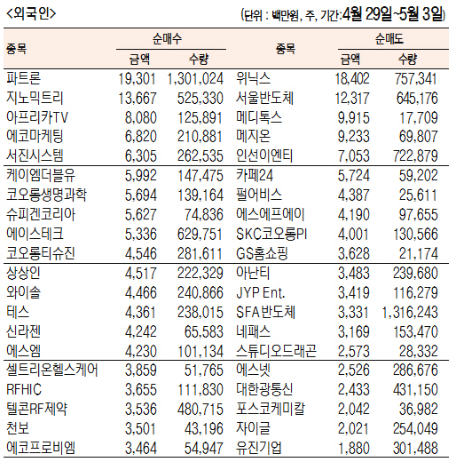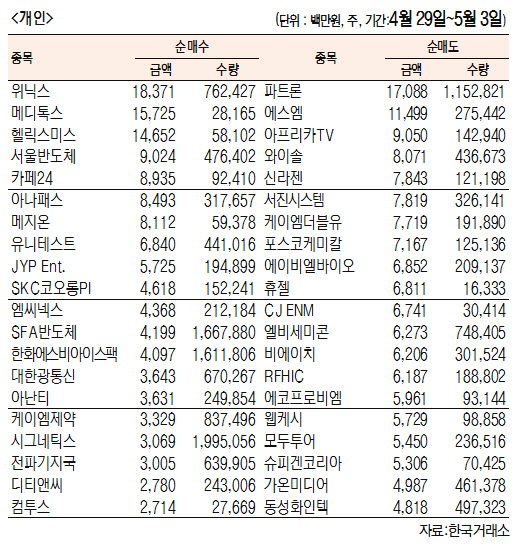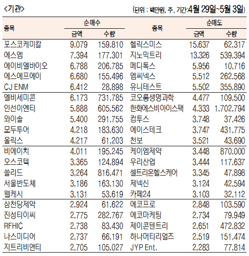 [Ç¥]ÁÖ°£ ÄÚ½º´Ú ±â°ü¡¤¿Ü±¹ÀΡ¤°³ÀÎ ¼ø¸Å¼ö¡¤µµ »óÀ§Á¾¸ñ(4¿ù 29ÀÏ~5¿ù 3ÀÏ)