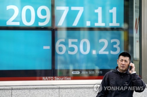 A pedestrian walks past a stock market indicator board in Tokyo, Japan, 25 March 2019. Tokyo stocks dropped sharply following concerns over the global economy. The 225-issue Nikkei Stock Average closed down 650.23 points, or 3.01 percent, at 20,977.11, its largest loss since December 2018. EPA/FRANCK ROBICHON