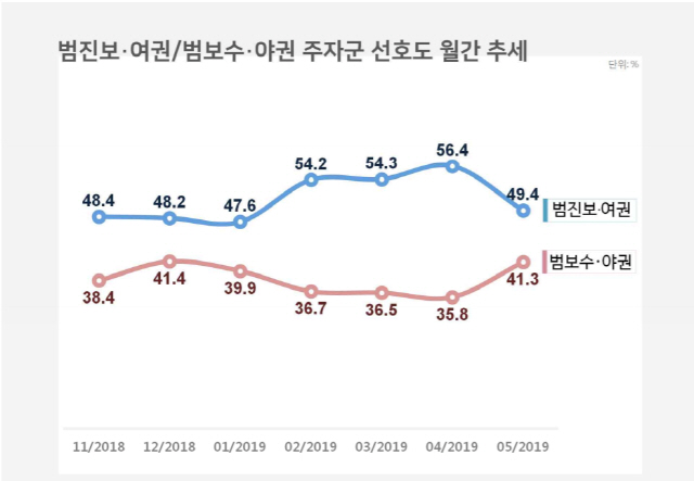 ¹üÁøº¸¡¤¿©±Ç ÁÖÀÚ±º(À̳«¿¬¡¤ÀÌÀç¸í¡¤±è°æ¼ö¡¤±èºÎ°â¡¤¹Ú¿ø¼ø¡¤½É»óÁ¤)ÀÇ ¼±È£µµ ÇÕ°è´Â 7.0%Æ÷ÀÎÆ® Ç϶ôÇÑ 49.4%, ¹üº¸¼ö¡¤¾ß±Ç ÁÖÀÚ±º(Ȳ±³¾È¡¤À¯½Â¹Î¡¤È«ÁØÇ¥¡¤³ª°æ¿ø¡¤¿À¼¼ÈÆ¡¤¾Èö¼ö)Àº 5.5%Æ÷ÀÎÆ® »ó½ÂÇÑ 41.3%·Î °ÝÂ÷´Â 8.1%Æ÷ÀÎÆ®·Î Å©°Ô Á¼ÇôÁ³´Ù. Áö³´Þ Á¶»ç¿¡¼´Â °ÝÂ÷°¡ 20.6%Æ÷ÀÎÆ®¿¡ ´ÞÇß´Ù. ÀÚ¼¼ÇÑ ³»¿ëÀº ¸®¾ó¹ÌÅͳª Áß¾Ó¼±°Å°ü¸®À§¿øÈ¸ ȨÆäÀÌÁö¸¦ Âü°íÇÏ¸é µÈ´Ù.