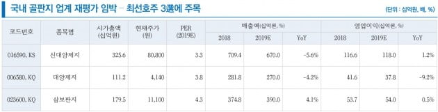 ÅÃ¹è ¹°µ¿·® È®´ë·Î ±¹³» °ñÆÇÁö ¼ö¿ä´Â Áõ°¡Çϰí, Áß±¹ÀÇ ¼öÀÔ °¨¼Ò·Î ¿øÀç·áÀÎ °íÁö´Â °¡°ÝÀÇ Ç϶ô ¾Ð·ÂÀÌ ³ô¾Æ ¿ìÈ£ÀûÀÎ ½ÃÀå ȯ°æÀÌ Á¶¼ºµÅ ÀÖ´Ù´Â ¼³¸íÀÌ´Ù. ¶Ç ´ÙÀ½´Þ Ÿ²Æ÷Àå ¸Å°¢À» À§ÇÑ ¿¹ºñÀÔÂûÀÌ ½Ç½ÃµÇ´Âµ¥, ¸Å°¢ Èñ¸Á°¡´Â 2018³â ½ÇÀû ±âÁØ PER 10¹è ¼öÁØÀ¸·Î ¸Å°¢ ¿Ï·á ½Ã ¾÷°èÀÇ ÀçÆò°¡ ¿äÀÎÀ¸·Î ÀÛ¿ëÇÒ °ÍÀ¸·Î ºÃ´Ù.