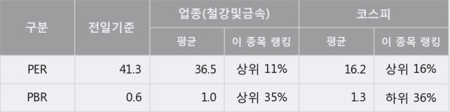 ÀüÀÏ Á¾°¡¸¦ ±âÁØÀ¸·Î ÀÌ Á¾¸ñÀÇ PER´Â 41.3¹è, PBRÀº 0.6¹èÀÌ´Ù. PER´Â ö°­¹×±Ý¼Ó¾÷Á¾ÀÇ Æò±Õ PER 36.5¹è ´ëºñ +4.8¹è ³ôÀº ¼öÁØÀ¸·Î ¾÷Á¾ ³»¿¡¼­ »óÀ§ 11%¿¡ ÀÖ°í, PBRÀº ö°­¹×±Ý¼Ó¾÷Á¾ÀÇ Æò±Õ PBR 1.0¹è ´ëºñ -0.4¹è ³·Àº ¼öÁØÀ¸·Î ¾÷Á¾ ³»¿¡¼­ »óÀ§ 35%¿¡ À§Ä¡ÇÑ´Ù.