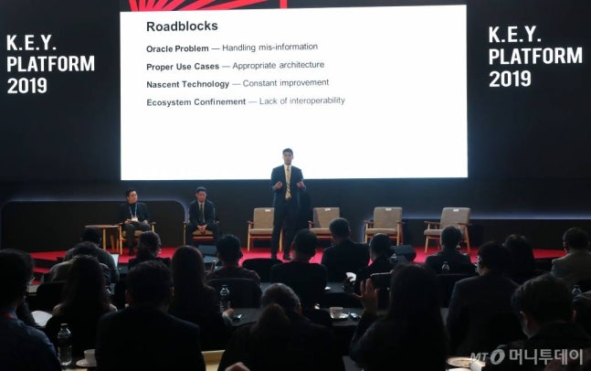 ÀçŰ Àå, ÄËÆ® È÷´Ù¿À ¸¶Å°½¬¸¶ ¾Æ¸£¸¶´Ù üÀÎ/ZS ºí·ÏüÀÎ °øµ¿Ã¢¾÷ÀÚ°¡ 26ÀÏ ¿ÀÀü ¿©Àǵµ ÄÜ·¡µå ¼­¿ï¿¡¼­ ¿­¸° ¸Ó´ÏÅõµ¥À̵̹ð¾î ±Û·Î¹ú ÄÜÆÛ·±½º 2019 ŰÇ÷§Æû(K.E.Y. PLATFORM)¿¡¼­ ±ÝÀ¶ ºí·ÏüÀÎÀÇ ºñÀü¿¡ ´ëÇØ °­¿¬Çϰí ÀÖ´Ù./ »çÁø=È«ºÀÁø ±âÀÚ