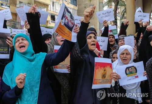 Supporters of Hezbollah carrying placards shout a slogan 'Death to America, Death to Israel and Death to the Saud', during a protest against Saudi Arabia, in front Al Qa'im mosque in the southern suburb of Beirut, Lebanon 26 April 2019. Tens of Hezbollah supporters protested at the invitation of university students in the educational mobilization of Hezbollah in Beirut. The protest was in solidarity with the innocent martyrs, victims of the brutal massacre and executions carried out by the Al - Saud henchmen against the Shiites in Al-Qatif and Al- Ehsaa. EPA/NABIL MOUNZER