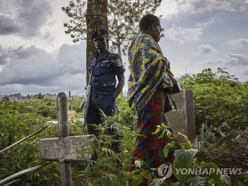A police officer guards the funeral of Ebola victims, a fifty year-old woman Kavira Marie-Rosea and thirty two-year-old man Mumbi Bomboko, at Kitatumba cemetery in Butembo, North Kivu province, Democratic Republic of the Congo, 16 May 2019 (issued 17 May 2019). Butembo is at the epicenter of Congo's Ebola crisis with multiple new cases, widespread community resistance to health workers and attacks carried out by the Mai Mai militia. EPA/HUGH KINSELLA CUNNINGHAM ATTENTION: This Image is part of a PHOTO SET