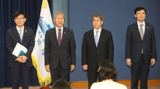 û¿Í´ë °æÁ¦¶óÀÎÀÌ 21ÀÏ Àü°Ý ±³Ã¼µÆ´Ù. ±è»óÁ¶ ½ÅÀÓ Á¤Ã¥½ÇÀå(¿ÞÂÊ)°ú ÀÌÈ£½Â ½ÅÀÓ °æÁ¦¼ö¼®(¿À¸¥ÂÊ)ÀÌ ÃëÀÓÀλ縦 Çϱâ À§ÇØ ±è¼öÇö Àü Á¤Ã¥½ÇÀå(¿ÞÂÊ µÑ°), À±Á¾¿ø Àü °æÁ¦¼ö¼®°ú ÇÔ²² ´ë±âÇϰí ÀÖ´Ù. û¿Í´ë»çÁø±âÀÚ´Ü °©ÀÛ½º·¯¿î û¿Í´ë °æÁ¦¶óÀÎ ±³Ã¼¿¡ ´ëÇÑ Á¤Ä¡±ÇÀÇ ¹ÝÀÀÀº ¾ù°¥·È´Ù. ¿©´çÀº ¡°ÀûÀçÀû¼Ò Àλ硱, ¾ß´çÀº ¡°È¸Àü¹® Àλ硱¶ó°í Æò°¡Çß´Ù. ƯÈ÷, °øÁ¤°Å·¡À§¿øÀå¿¡¼ û¿Í´ë·Î ÀÚ¸®¸¦ ¿Å±ä ±è»óÁ¶ ½ÇÀå¿¡ ´ëÇÑ ¸»µéÀÌ ¸¹¾Ò´Ù.