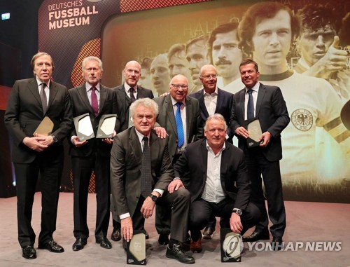 Former German soccer players (back, L-R) Guenter Netzer, Paul Breitner, Matthias Sammer, Uwe Seeler, Franz Beckenbauer, Lothar Matthaeus; (front, L-R) Sepp Maier and Andreas Brehme pose during the opening gala of the 'Hall Of Fame' of German football in Dortmund, Germany, 01 April 2019 (issued 02 April 2019). The Hall Of Fame will be part of the permanent exhibition in the German Football Museum, where players and coaches of men's and women's soccer of German origin will be honoured for their outstanding achievements in shaping German soccer from 1900 until today. EPA/RALF IBING / POOL