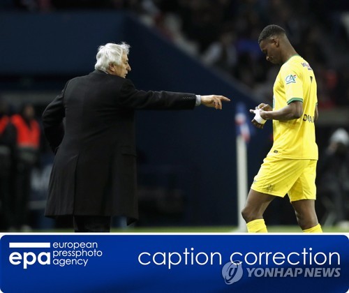 Nantes headcoach Vahid Halilhodzic speaks to his player Kalifa Coulibaly (R) during the French Cup (Coupe de France) semifinal soccer match between PSG and FC Nantes at the Parc des Princes stadium in Paris, France, 03 April 2019. EPA/YOAN VALAT (CORRECTION)