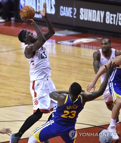 Toronto Raptors forward Pascal Siakam (L) goes to the basket as Golden State Warriors forward Draymond Green (C) falls to the ground during the second half of the NBA Finals game one at Scotiabank Arena in Toronto, Canada, 30 May 2019. EPA/WARREN TODA SHUTTERSTOCK OUT
