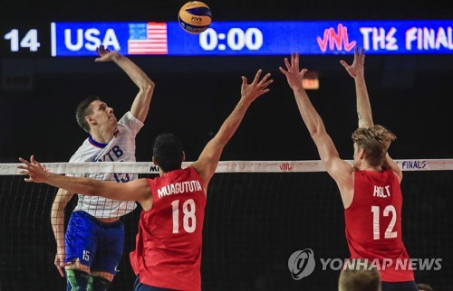 Russia's Victor Poletaev (L) in action against USA's Garrett Muagututia (C) and USA's Maxwell Holt (R) during the FIVB Volleyball Men's Nations League final round match between USA and Russia at Credit Union 1 Arena in Chicago, Illinois, USA, 14 July 2019. EPA/TANNEN MAURY